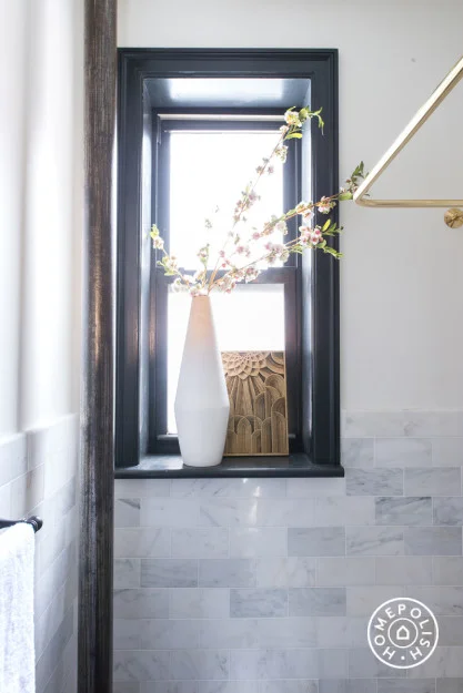 We upgraded a dated bathroom for a fresher, more modern look, while incorporating industrial elements to celebrate the pre-war building. Storage solutions were customized for the limited amount of space.